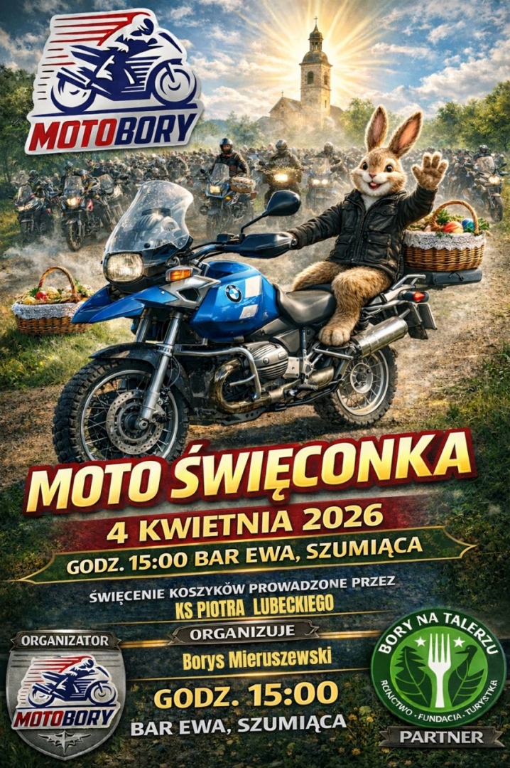 Zapraszamy na V już z koleji MotoBorowiacką Święconkę. Jest to już nieodzowna tradycja naszej społeczności. Dzięki temu iż odbywa się ona na terenie Borów Tucholskich jest niewątpliwą atrakcją turystyczną. Z roku na rok przybywa do nas wielu nowych motocyklistów z różnych rejonów kraju, sławiąc naszą okolicę w Polsce !!! 14.30 Zbiórka pod Bar Ewa, Szumiąca 15.00 Wyjazd parady z Szumiącej do Lubiewa 15.30 Święcenie koszyków i motocykli Święcenie ks Piotr Lubecki