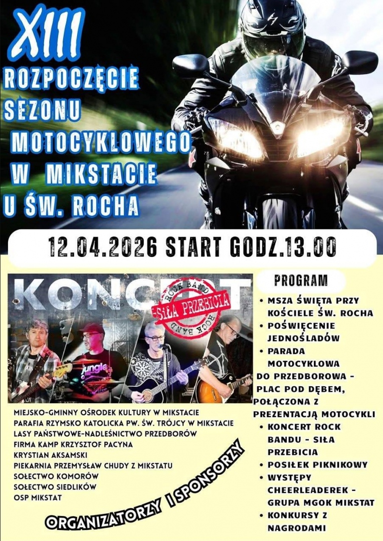 Zapraszamy na XIII Rozpoczęcie Sezonu Motocyklowego w Mikstacie. To wydarzenie to doskonała okazja do zgromadzenia miłośników motocykli w jednym miejscu i wspólnej zabawy.